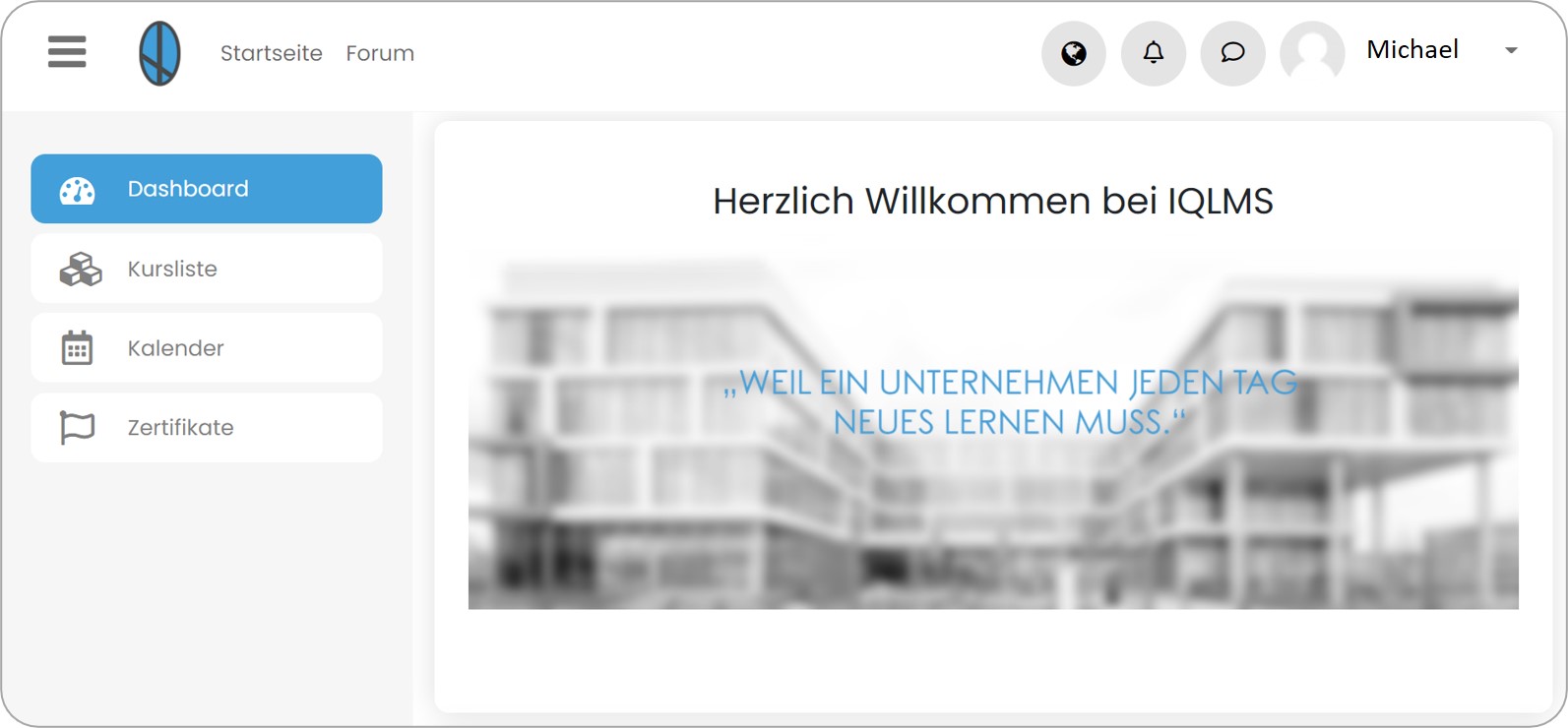 Cover-Subtitel: Mit der Vorlage von IQLMS gestalten Sie im Handumdrehen Ihre eigene Startseite mit modernem Design. Fügen Sie zunächst im Titel z.B. den Namen Ihrer Plattform oder Ihrer Firma ein und wecken Sie mit diesem Subtitel das Interesse.
